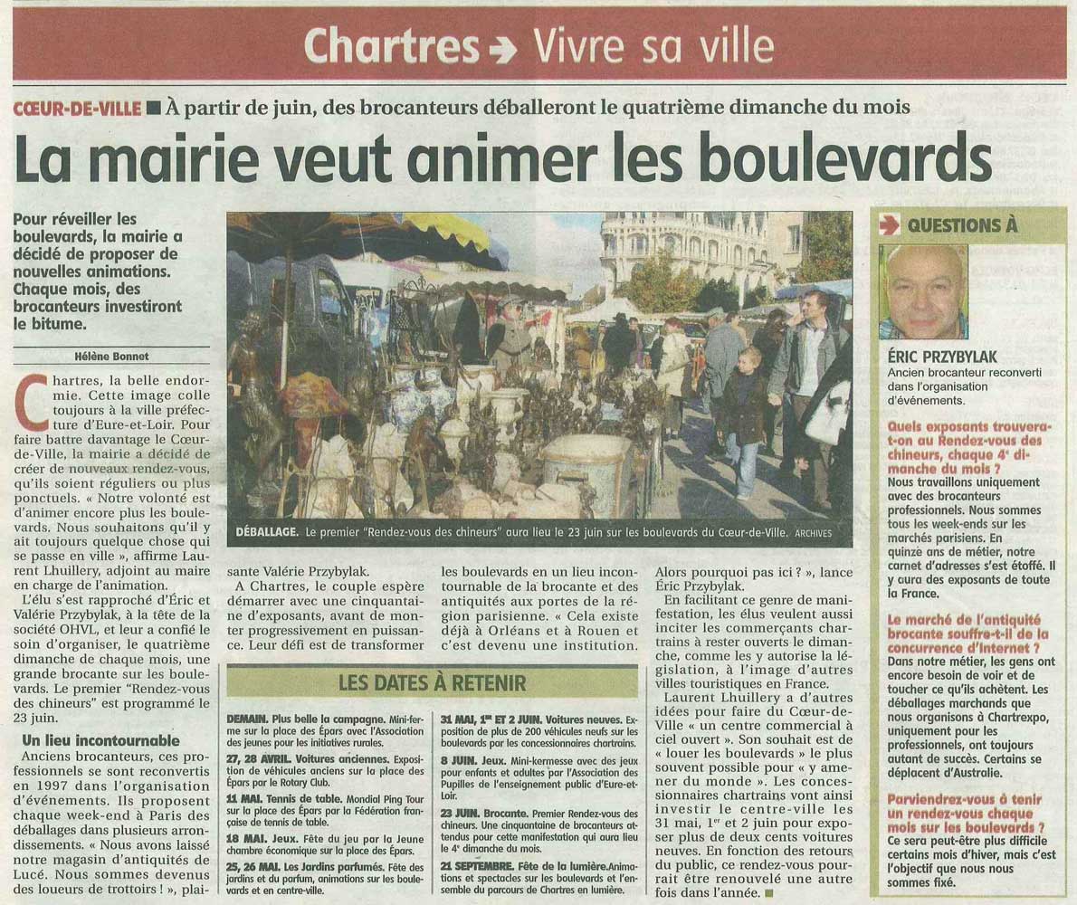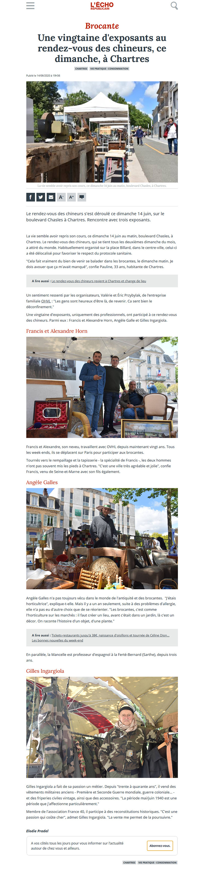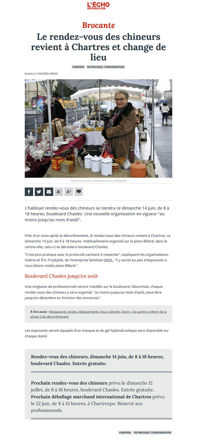 "La vie semble avoir repris son cours, ce dimanche 14 juin au matin, boulevard Chasles, à Chartres. Le rendez-vous des chineurs, qui se tient tous les deuxièmes dimanche du mois, a attiré du monde. Habituellement organisé sur la place Billard, dans le centre-ville, celui-ci a été délocalisé pour favoriser le respect du protocole sanitaire." - L'ÉCHO RÉPUBLICAIN